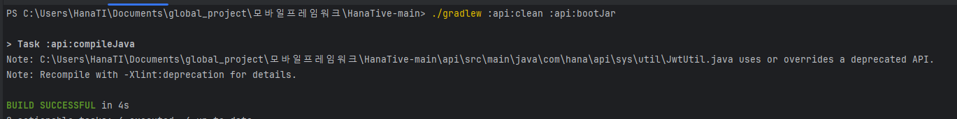 api서브 모듈만 웹서버로 띄우면 되기 때문에 gradle 화면에서 api모듈만 bootJar를 통해 jar를 생성해줍니다.