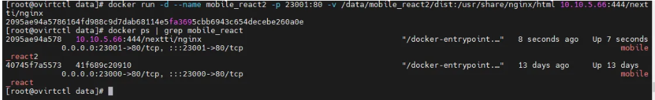 docker run -d -name mobile_react -p 23001:80 -v /data/dist:/usr/share/nginx/html 10.10.5.66:444/nextti/nginx