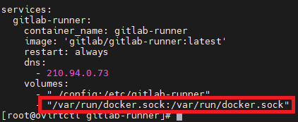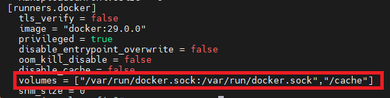 이 소켓 파일을 gitlab-runner의 config.toml에서 volumes에 추가를 해줍니다.