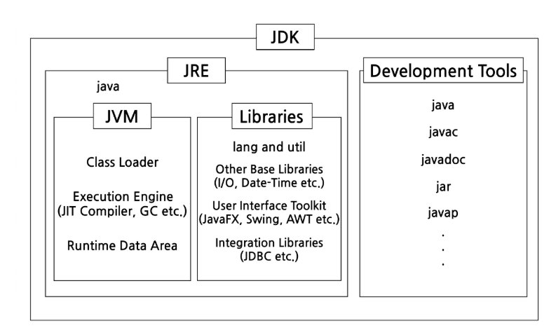 말 그대로 jdk 내부에는 자바 개발에 필요한 라이브러리들과 자바 컴파일에 필요한 javac, jar파일 제어에 필요한 jar 도구와 같은 개발 도구 들이 포함되어있습니다.