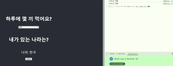 하루에 몇 끼 먹어요?라는 input박스는 number라는 상태를 관리하기 때문에 location객체와는 관련이 없기 때문에 useEffect 호출이 발생하지 않을 거라 생각했습니다.