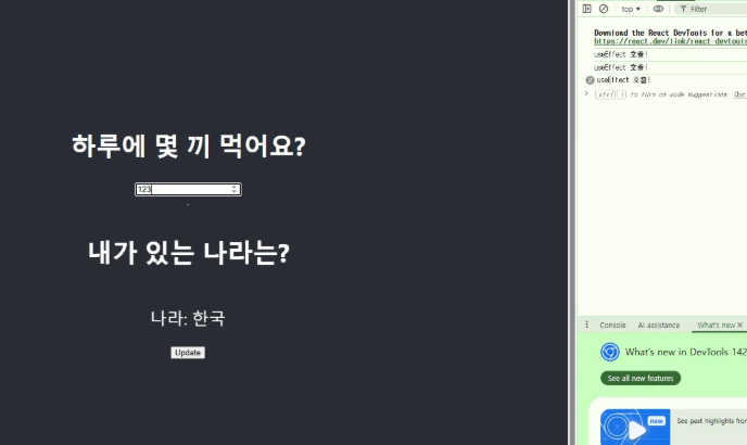 관련없는 상태인 number상태를 변경했을땐 useEffect가 호출되지 않았지만, korea상태를 변경했을땐 useEffect가 호출된것을 확인할 수 있습니다.