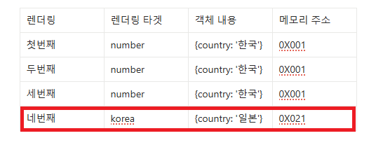 마운트 시점에 location변수에 메모리에 캐싱된 객체를 저장합니다. number상태를 변경할때는 캐싱된 데이터를 가져오고 korea상태를 변경했을땐 객체가 수정되어 메모리에 수정된 데이터를 다시 캐싱합니다. 그렇기 때문에 렌더링 후에 useEffect는 location이 변경되었다고 판단하고 콜 백을 호출하게 되는 것입니다.